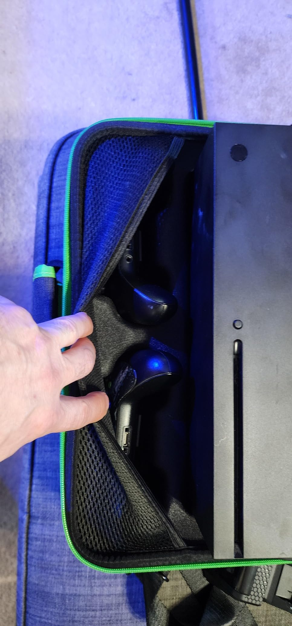 Spacious Storage: With ample room, this bag fits the Xbox Series X/S, 2 controllers, cables, and more, including pockets for CDs and DVDs, keeping everything organized in one place. The main compartment fits the Xbox Series X perfectly. The front pocket has 2 spots for controllers and fits them well.