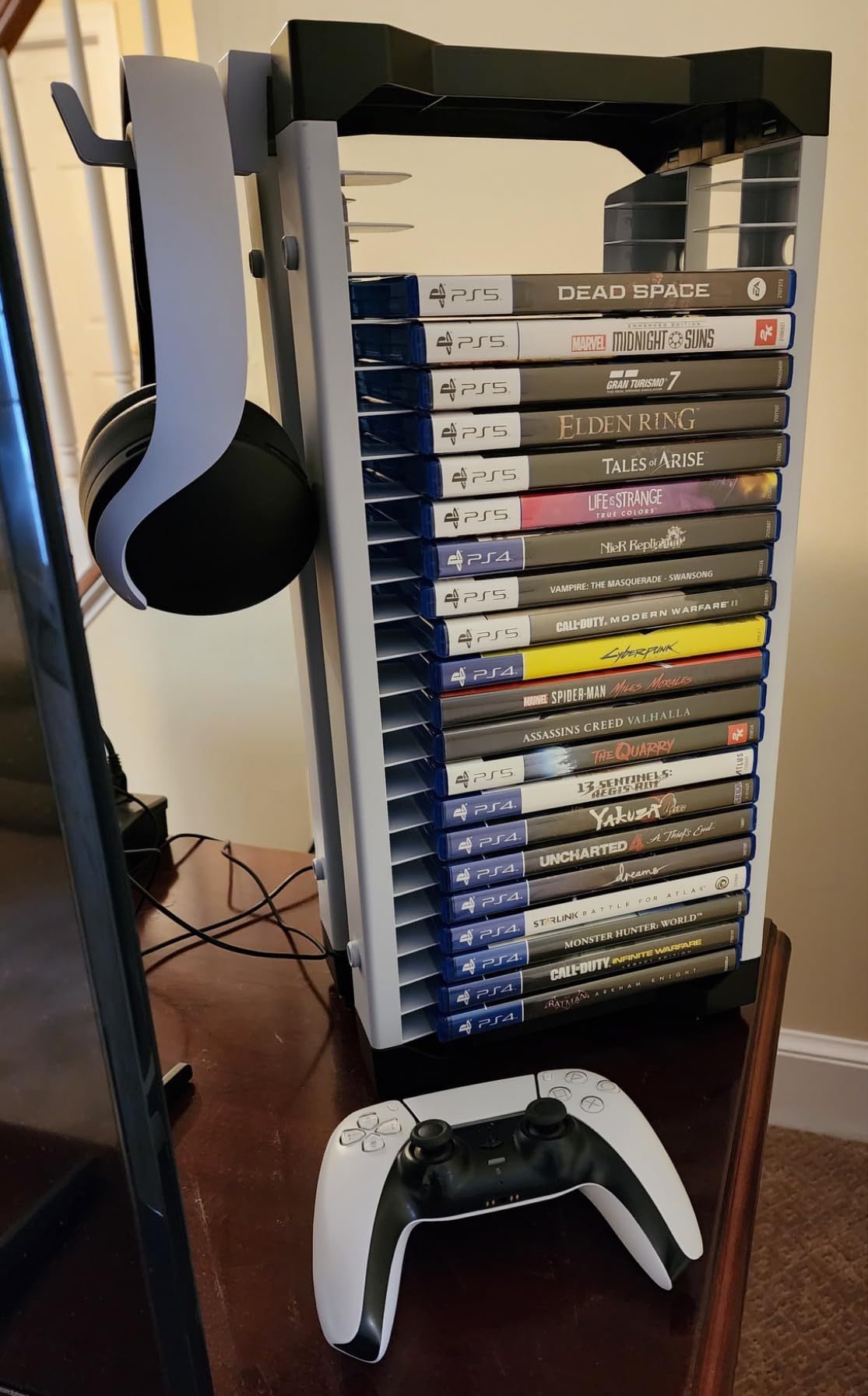 Save Space: Instead of letting your games clutter up your gaming room or living room, store them in a compact tower that takes up minimal floor space. It includes 2 headset hooks to hold your headset on the side.