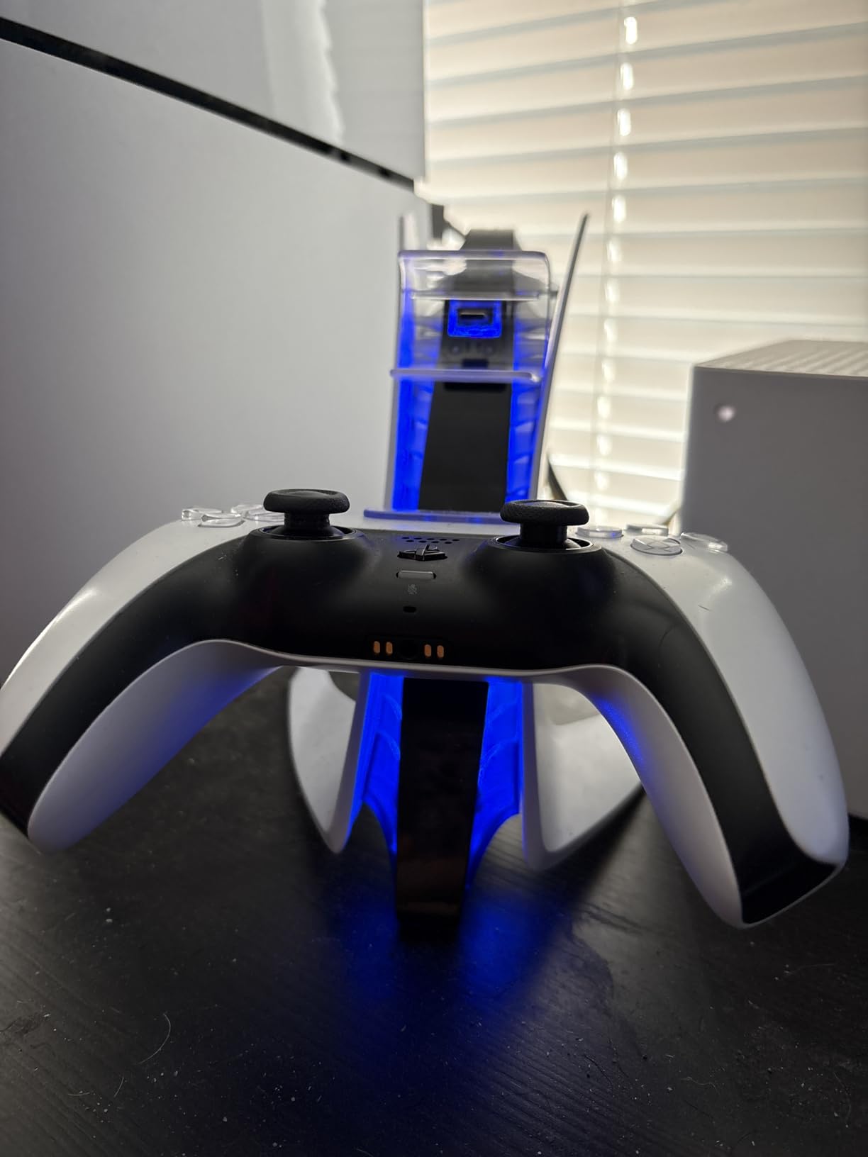 - PS5 CONTROLLER DOCK LED - It is smart and simple. Lights are nice look. The charging status is seen from your PS5 controller. When it is charging, your ps5 controller will turn orange. When it is charged fully, your ps5 controller turns blue light. The blue light of the charging dock is a atmosphere light and it is not used to see the charging status.