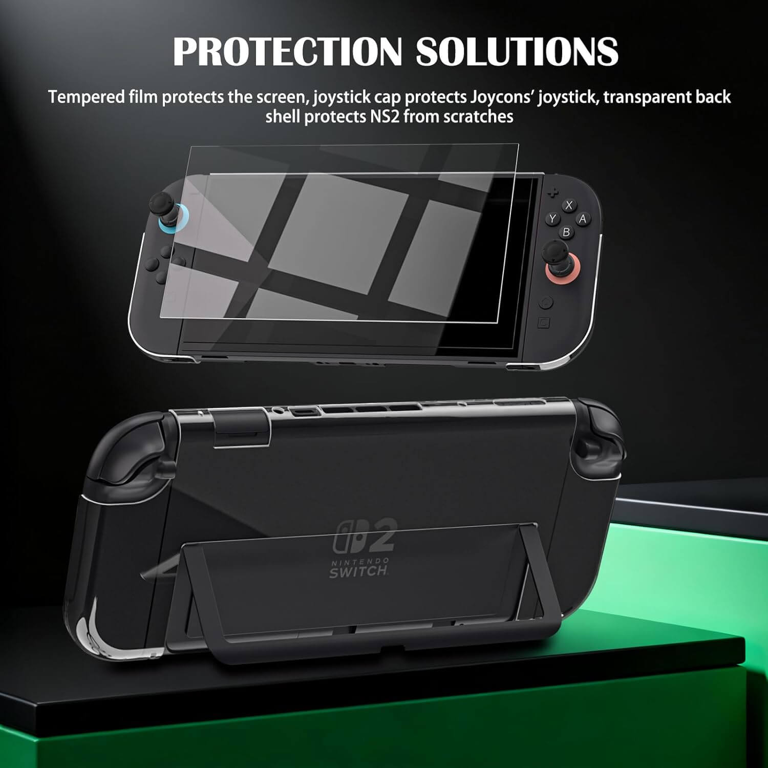- Full Console Protection with Clear Shell and Tempered Glass - Get dual screen protectors, a clear protective shell, thumb grips, and joycon covers—offering total protection against scratches, fingerprints, and shock. Keep your Switch 2 safe while maintaining a stylish, dockable design