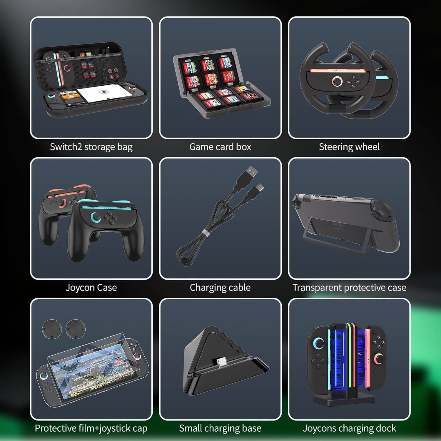 - All-in-One 9-in-1 Accessories Bundle for Switch 2 Gamers - This complete switch 2 accessories bundle includes a carrying case, charging dock, screen protectors, joycon grips, steering wheels, and more. Perfect for new nintendo switch 2 owners who want an all-in-one kit for travel and everyday use. Compatible with 2025 console only